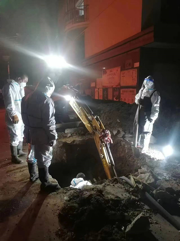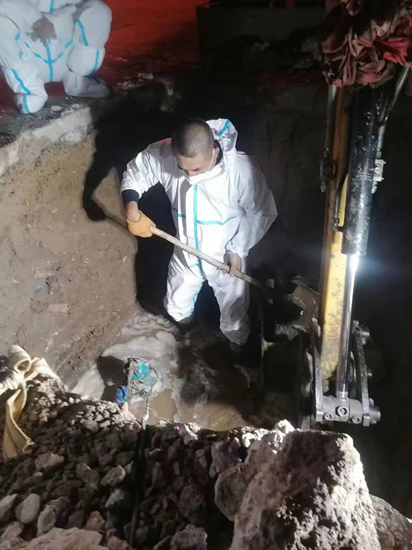 當(dāng)他們剛剛搶修完畢,又接到了金都園小區(qū)二次網(wǎng)發(fā)生跑水故障的搶修任務(wù),于是搶修人員又匆匆趕往現(xiàn)場。排查時發(fā)現(xiàn),水流是由西向東流入閥門井,初步判斷跑水點(diǎn)可能位于閥門井的西側(cè)。他們現(xiàn)場制定搶修方案后,立即開始尋找漏點(diǎn)。由于此處管網(wǎng)敷設(shè)錯綜復(fù)雜,直埋的燃?xì)?、供排水等多種管道間距緊密,無法使用機(jī)械作業(yè),只能靠人工探挖,經(jīng)過近7個小時的摸排,最終發(fā)現(xiàn)跑水點(diǎn)位于一根DN100的直埋管道抽頭處。由于該段管道腐蝕嚴(yán)重閥門關(guān)閉不嚴(yán),不斷有熱水通過漏水點(diǎn)流出,給施工作業(yè)帶來了一定的困難,為了加快排水速度,他們一邊使用抽水泵持續(xù)抽水,一邊穿著水褲下到溝內(nèi)擴(kuò)大泄水口。盡管此時已是深夜,可搶修人員依然任勞任怨的奮戰(zhàn)在現(xiàn)場,連夜進(jìn)行泄水、補(bǔ)焊、打卡處理,經(jīng)過近20個小時的連續(xù)奮戰(zhàn),于25日上午11點(diǎn)圓滿完成了搶修任務(wù),恢復(fù)了供熱。